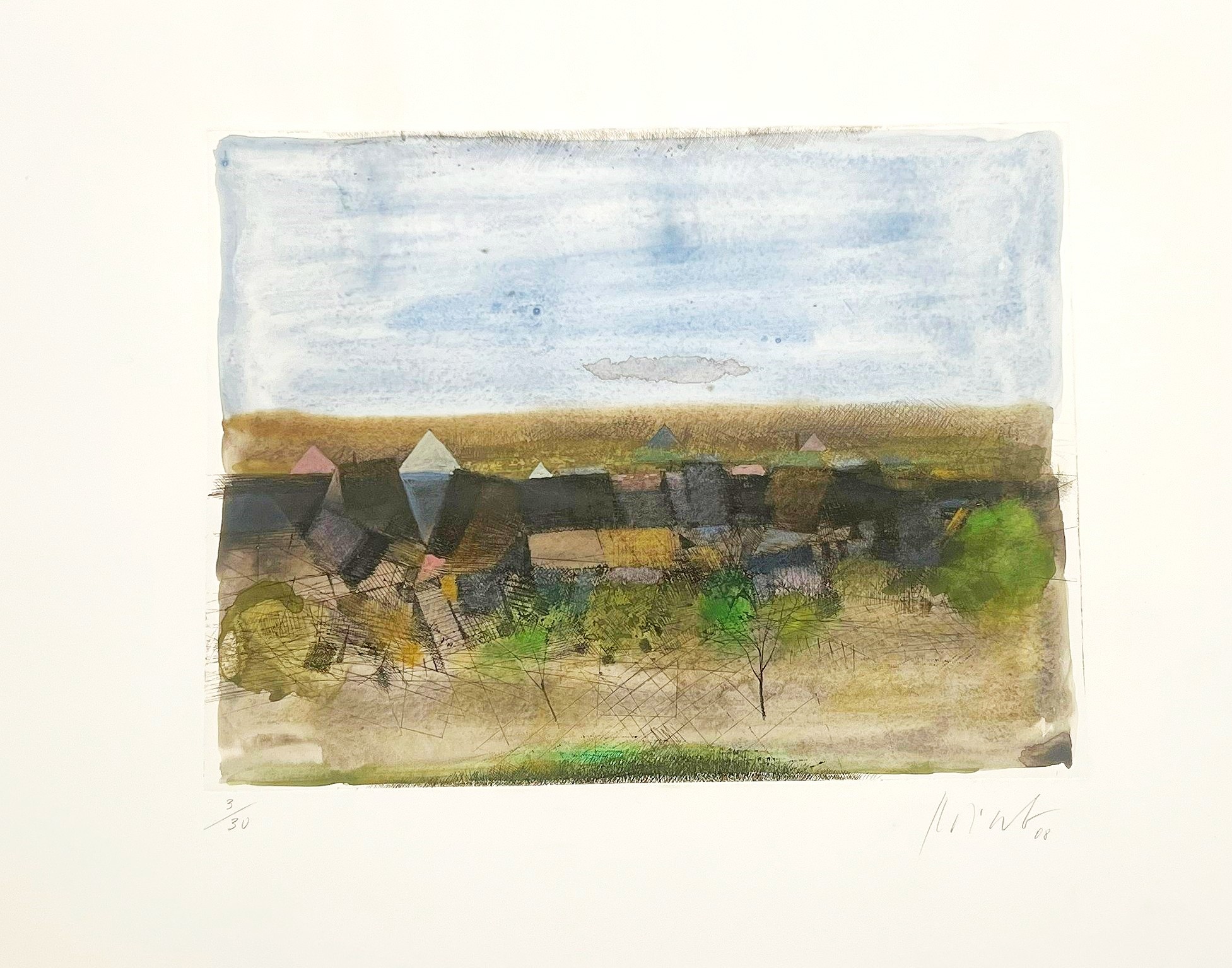 (313) Dorfansicht im Weinviertel, 3/30, handaquarelliert, 2008, BL approx. 50 x 65 cm, original color etching on paper, hand watercolored