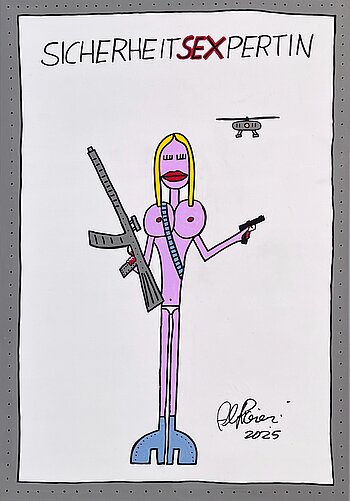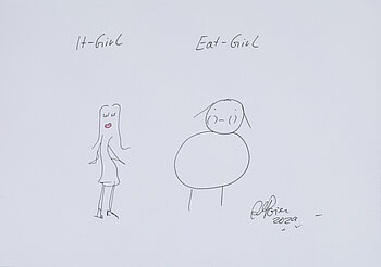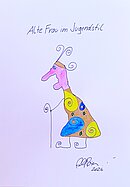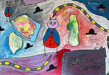 In Poier's second cabaret program "Zen" - for which he was awarded the German Cabaret Prize, the Prix Pantheon, and the German Comedy Prize - drawings, pictures, and objects were already influential in terms of style. Through guest appearances in many national, but also German and Swiss television shows with high ratings, Poier's Dadaesque art was presented to an audience of millions. Works like "Kami-Katze", "Border-Leiner", "Streich-Wurst", "Kater-Billa" or "Muku-Muku" reached a large public in this way.